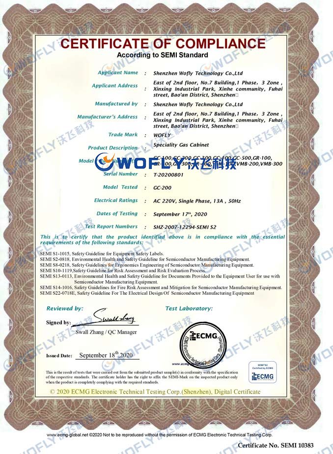 因特種氣體的特殊性,承載特種氣體的氣瓶柜體須為防爆柜體,同時(shí)為保證半導(dǎo)體制程工藝中特種氣體的穩(wěn)定供氣和安全,應(yīng)具備多種功能,如柜內(nèi)氣體泄漏偵測(cè)報(bào)警、PLC面板控制、全自動(dòng)吹掃等,提高使用安全系數(shù),有效的保護(hù)生產(chǎn)安全和人員的生命安全。其次,半導(dǎo)體行業(yè)配置電子特氣柜需要擁有SEMI S2認(rèn)證。
